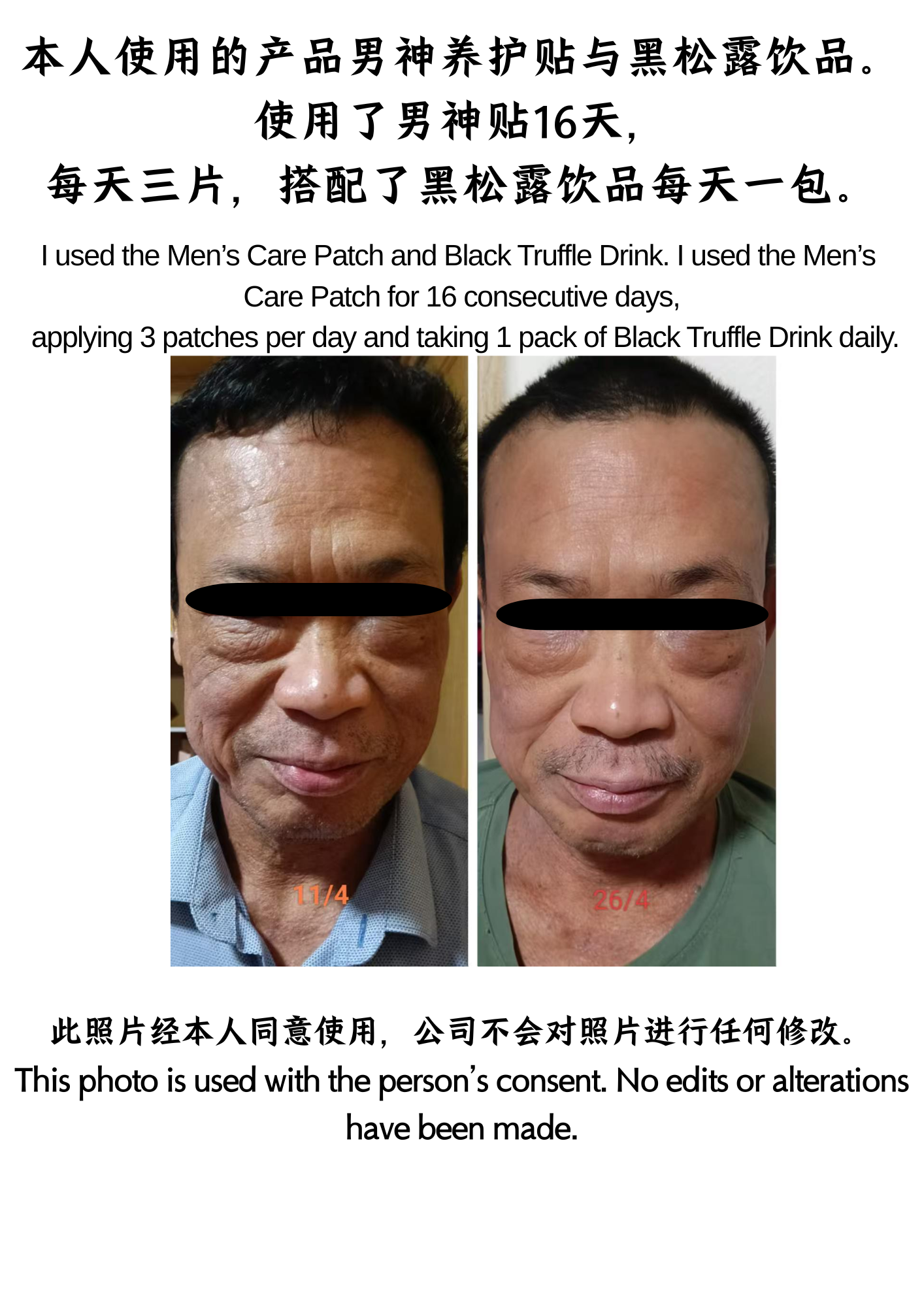 本人使用的产品为:男神养护贴与黑松露饮品。 使用了男神贴16天, 每天三片,搭配了黑松露饮品每天一包。