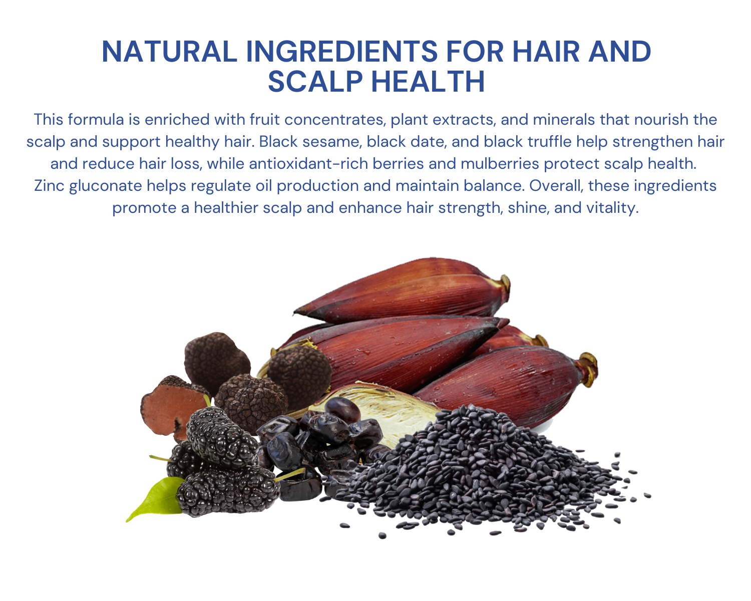 Water, Mixed Berry Concentrates (Apple, Strawberry, Raspberry, Cherry, Cranberry, Blackcurrant, Gooseberry), Banana Powder (Maltodextrin, Citric Acid, Banana), Trehalose, Concentrated Apple Juice, Mixed Juice Concentrates (Purple Carrot, Lemon), Phospholipids, Arabic Gum Jujube Seed Powder (Jujube Seed, Maltodextrin), Black Truffle Powder, Blackcurrant Concentrate, Mulberry Powder, Black Date Powder, Black Sesame Powder, Food Flavoring, Sucralose, Steviol Glycosides, Zinc Gluconate, Citric Acid.