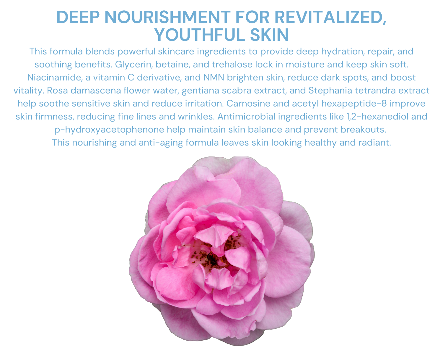 Water, propylene glycol, glycerin, niacinamide, damask rose (Rosa damascena) flower water, bifida ferment filtrate, betaine, 1,2-hexanediol, p-hydroxyacetophenone, trehalose, 3-o-ethyl ascorbic acid Carnosine, butylene glycol, b-nicotinamide mononucleotide, caprylhydroxamic acid, polysorbate-80, ethylhexylglycerin, gentiana scabra extract, stephania tetrandra extract, acetyl hexapeptide-8