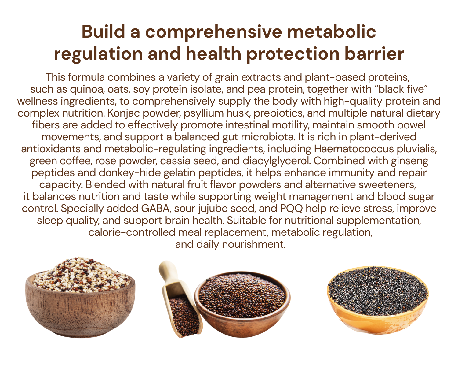 - Lunch :Red quinoa powder, vegetarian cereal powder, chia seed powder, oat powder, hemp seed powder, cassia seed powder, radish seed powder, whole milk powder, instant coffee powder, erythritol, corn flour, psyllium husk powder, konjac powder, microencapsulated astaxanthin powder,