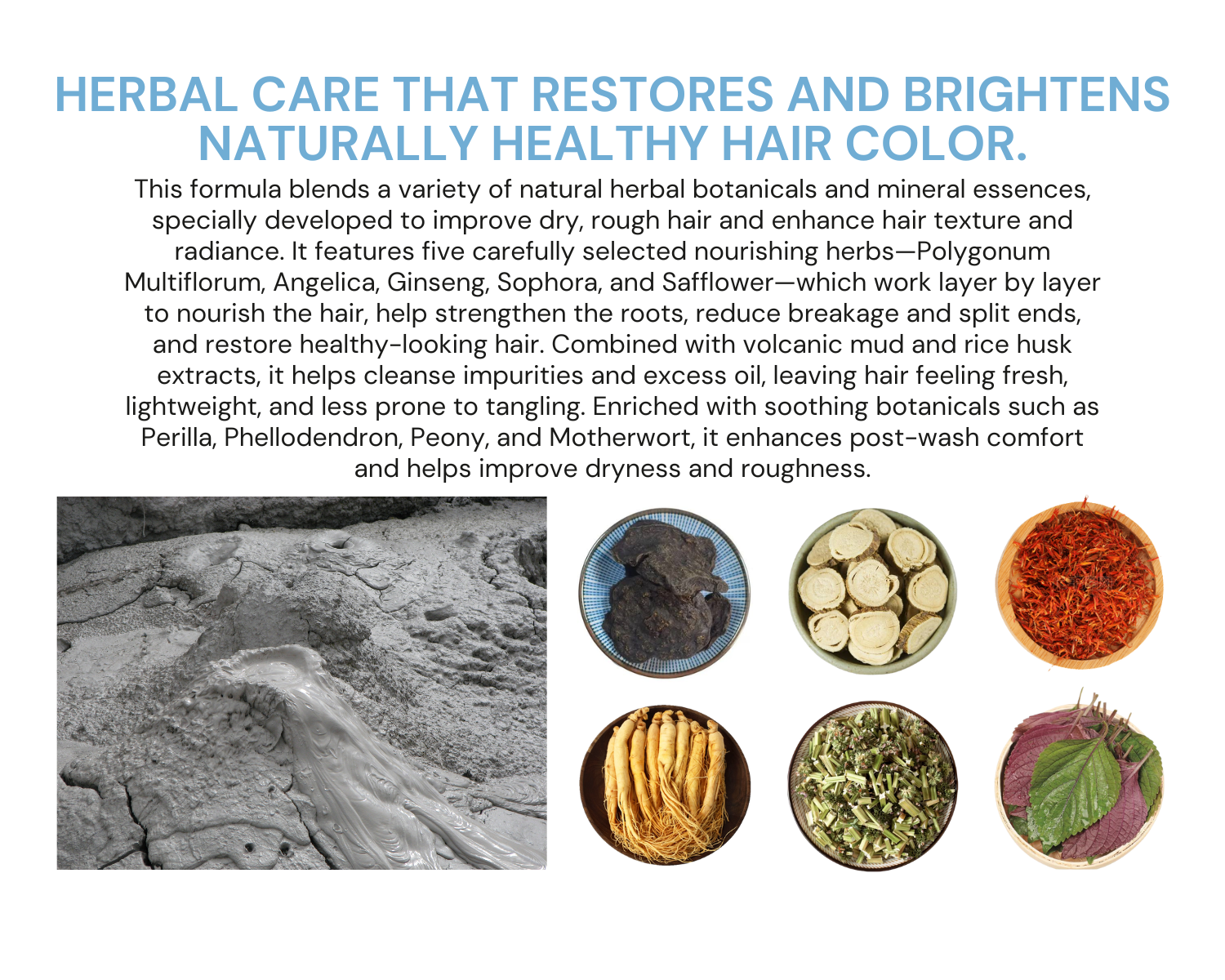 Water, Glycerin, Biota Orientalis Leaf, Polygonum Multiflorum, Angelica Root, Butanediol, PEG-40 Hydrogenated Castor Oil, Sophora Root, CI 77019, Ginseng Root, Safflower, Rice Husk, CI 77491, DMDM Hydantoin, Methylparaben, Volcanic Mud, Xanthan Gum