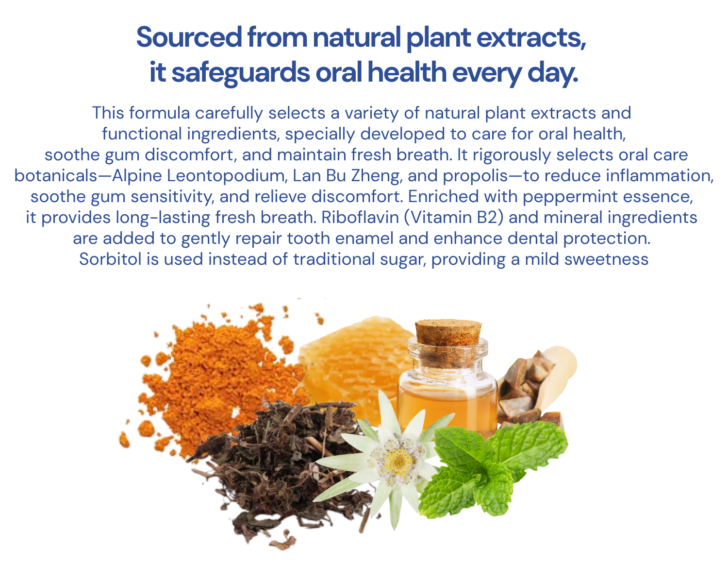 - Sorbitol, hydrated silica, water, PEG-8, sodium lauryl sulfate, edible flavoring, cellulose gum, xanthan gum, menthol, sodium saccharin, riboflavin (Vitamin B2), tetrasodium pyrophosphate, sodium phytate, disodium phosphate, sodium benzoate, Alpine Leontopodium (Leontopodium alpinum) extract, Lan Bu Zheng extract, propolis extract.
